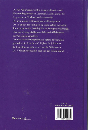 Ds. A.J. Wijnmaalen - Het gekrookte riet zal Hij niet verbreken. Verslag begrafenis en acht preken. Woord vooraf: ds. F. Mallan. Naamstempel op titelblad, verder in prima (nieuw)staat.