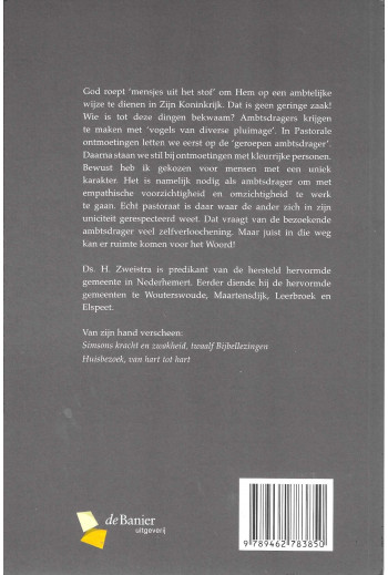 Dit is een boek met de titel 'Pastorale ontmoetingen' geschreven door Ds. H. Zweistra. Het gaat over bezinning op het pastoraat. Op de achterkant staat een korte tekst over de inhoud en een lijst met andere werken van de auteur.